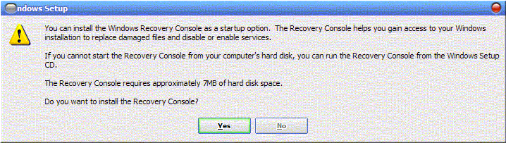 - You will see a screen prompt as in the attached picture. Click on "yes" to install the Recovery Console. In XP (I'm not sure about Win2000) Dynamic Setup will want to connect to Microsoft and update setup files. If allowed, it will update setup files and present an error box, which you can click on OK to bypass, and then restart itself and finish.