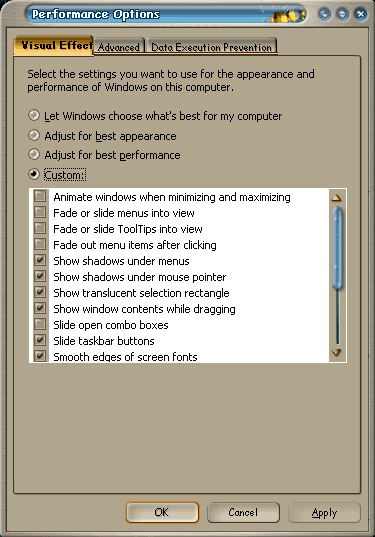 Choose what's best ....thanks but no thanks. I have no idea how Windows decides "what's best" and I believe that a human being with thumbs and the ability to reason can do a better job. Adjust for best appearance .....this means every little bell, whistle, and gee-gaw is turned on, which is what you are (hopefully) trying to avoid. Adjust for best performance .....essentially this turns all of those things off. Including the Luna color scheme/visual style, which I kind of like, Fisher Price colors or not. Custom - my preference. I leave enabled the following: